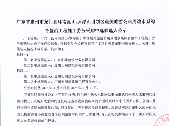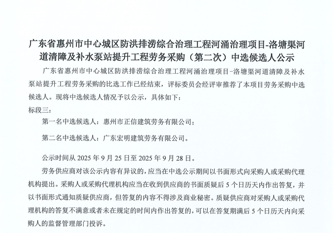 廣東省惠州市中心城區(qū)地下管網(wǎng)系統(tǒng)提升工程-內(nèi)街小巷排水管網(wǎng)病害修復(fù)及錯混接改造項目一期施工勞務(wù)采購(第二次)中選候選人公示……